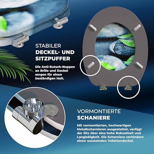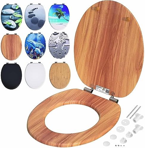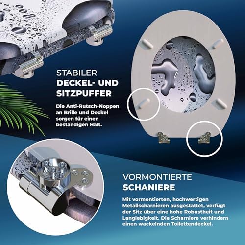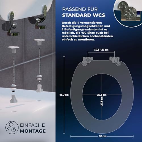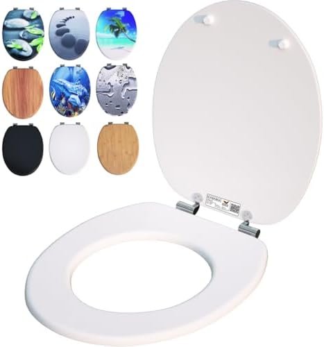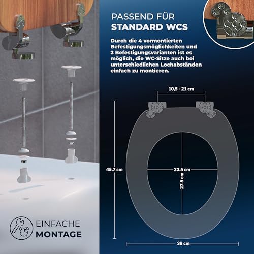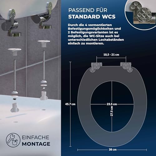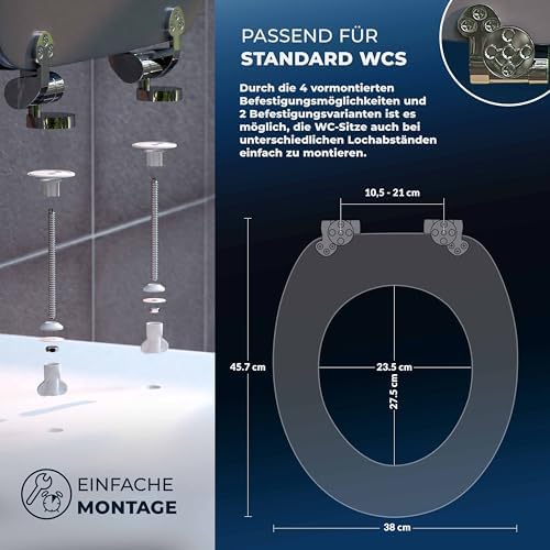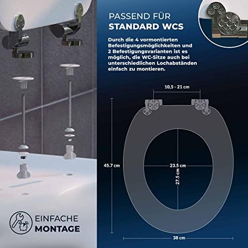 Hergestellt aus einem strapazierfähigen MDF-Holzkern und ausgestattet mit rostfreien Metallscharnieren, bietet dieser Toilettensitz nicht nur Stabilität, sondern auch eine optimale Anpassung. Der verstellbare Scharnierabstand von 10,5 bis 21 cm gewährleistet, dass der Deckel auf nahezu jede Standard-Toilette passt.