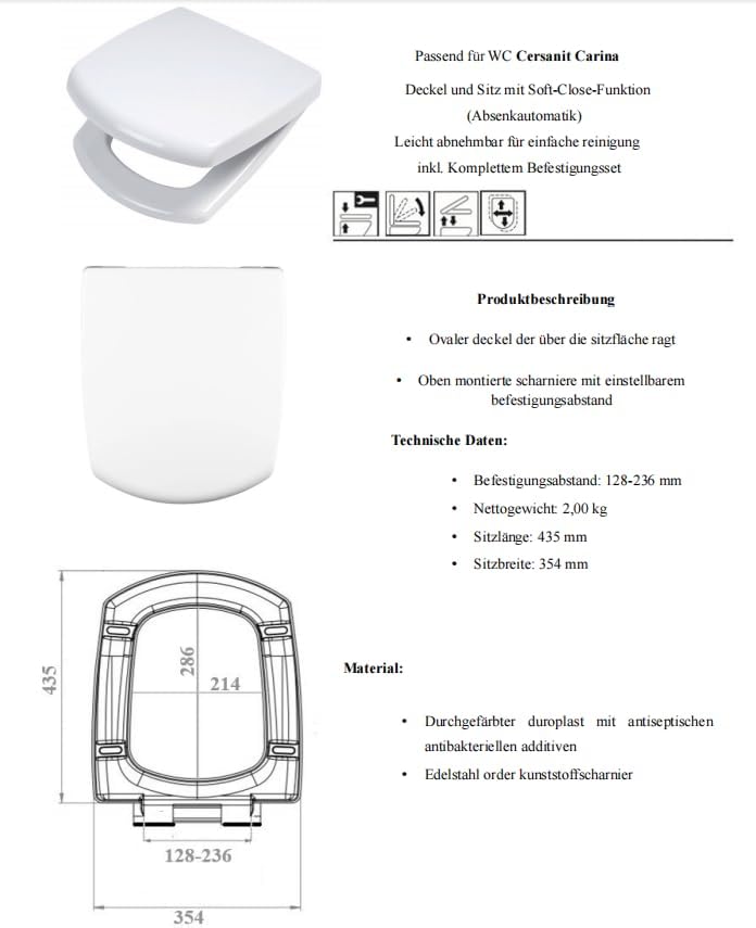 Ramm Toilettensitz mit Absenkautomatik | Antibakterieller Duroplast WC Sitz für Cersanit Carina | Einfaches Anbringen fü