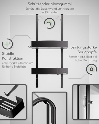 Ein weiteres Highlight ist die intelligente Gummipolsterung, die in Kombination mit starken Saugnäpfen agiert. Diese sorgen nicht nur für einen festen Halt des Hängeregal, sondern schützen auch Ihre Duschwand vor möglichen Beschädigungen. So bleibt Ihr Badezimmer stets in einem einwandfreien Zustand.